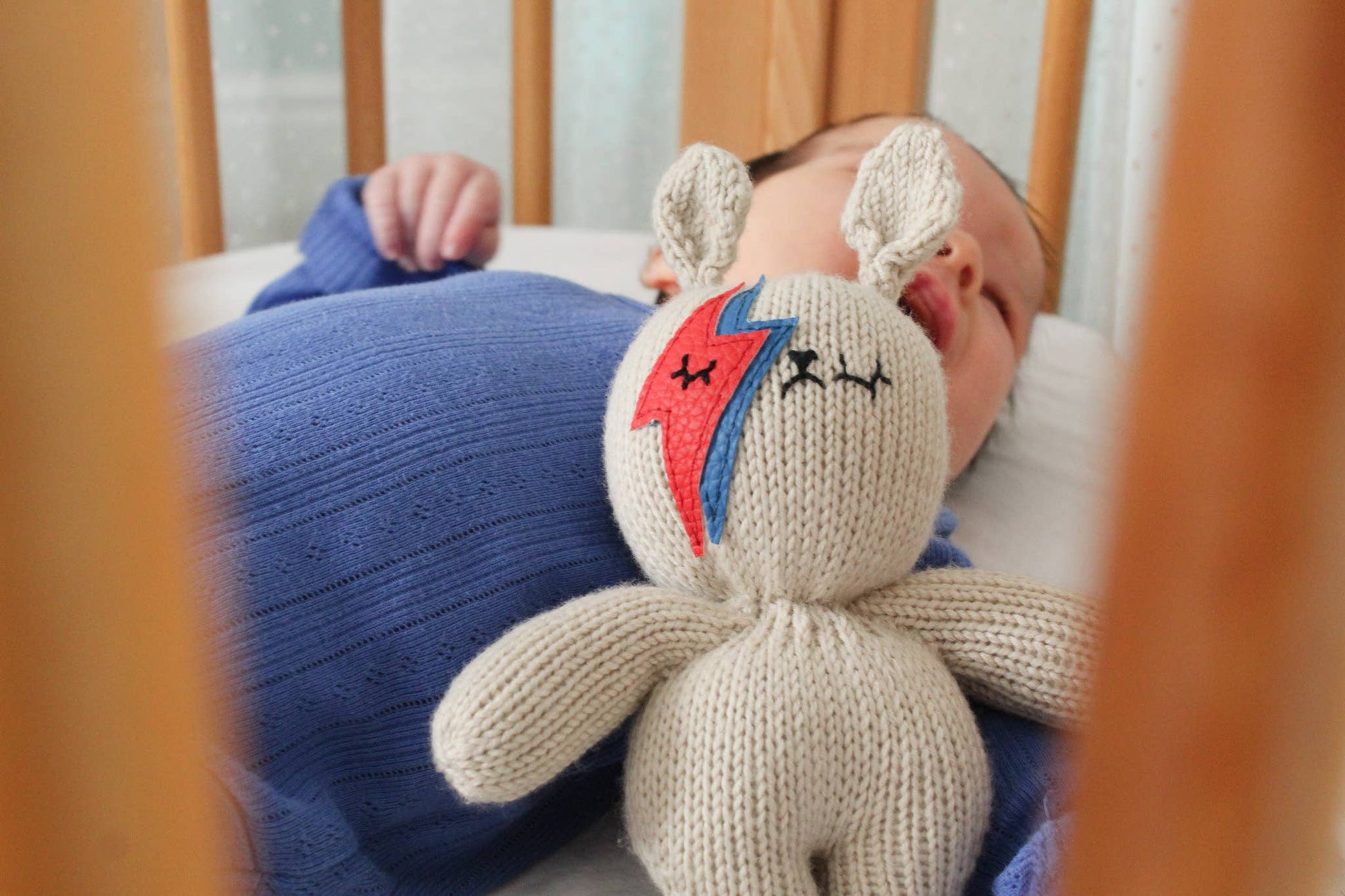 Handknitted handheld rattle with 'Bowie' flash in red and blue. Handknitted with merino wool, scientifically proven to help regulate little ones sleep patterns.