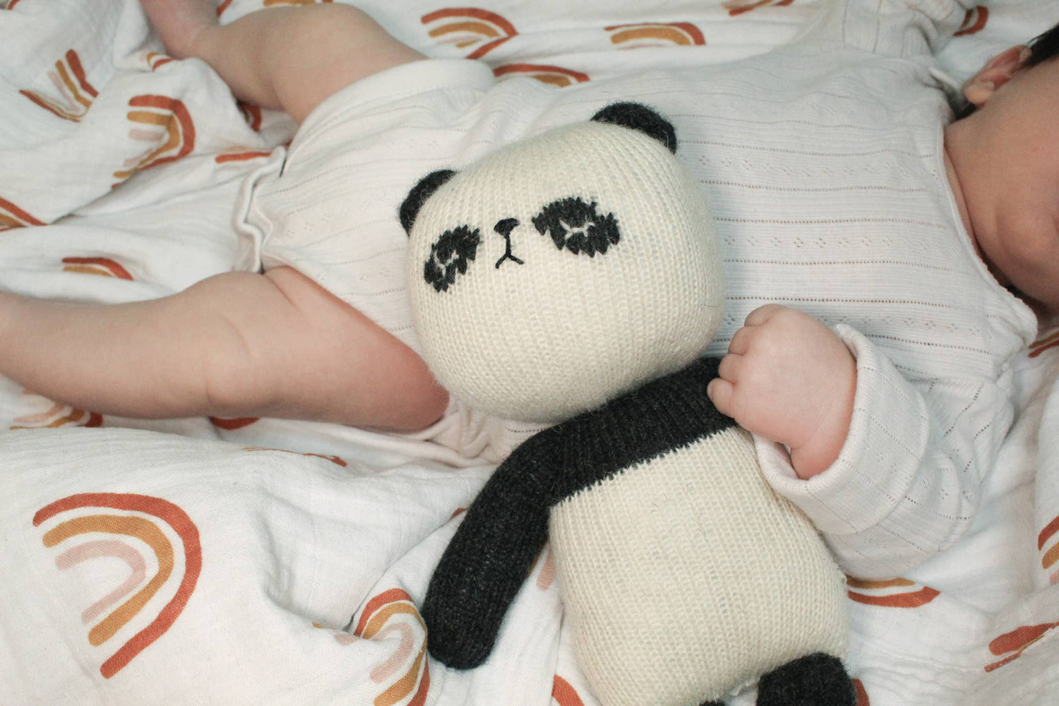 Handmade 'Archie the panda' toy made from lambswool, filled with stuffing made from recycled plastic bottles.