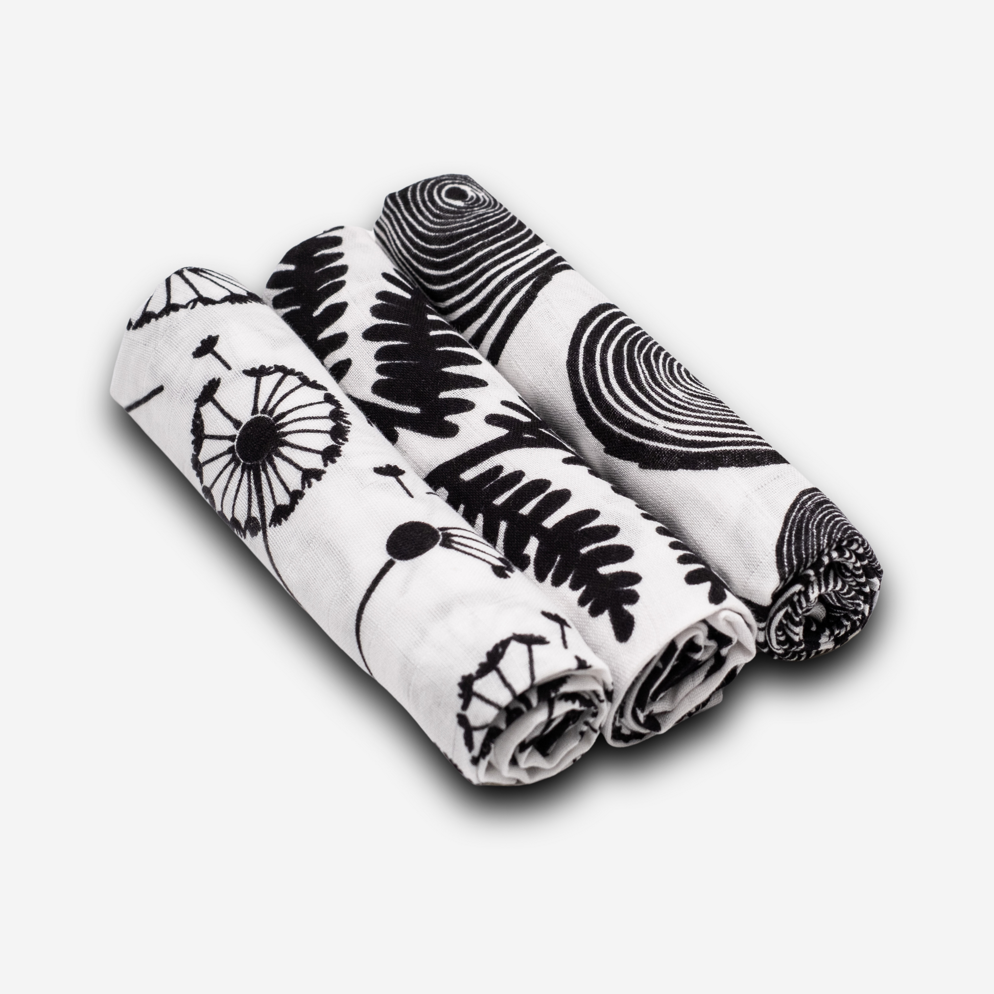 Pack includes a trio of black and white muslin squares in three designs - 1 x fern, 1 x dandelion and 1 x tree ring. Presented in our gorgeous box packaging.