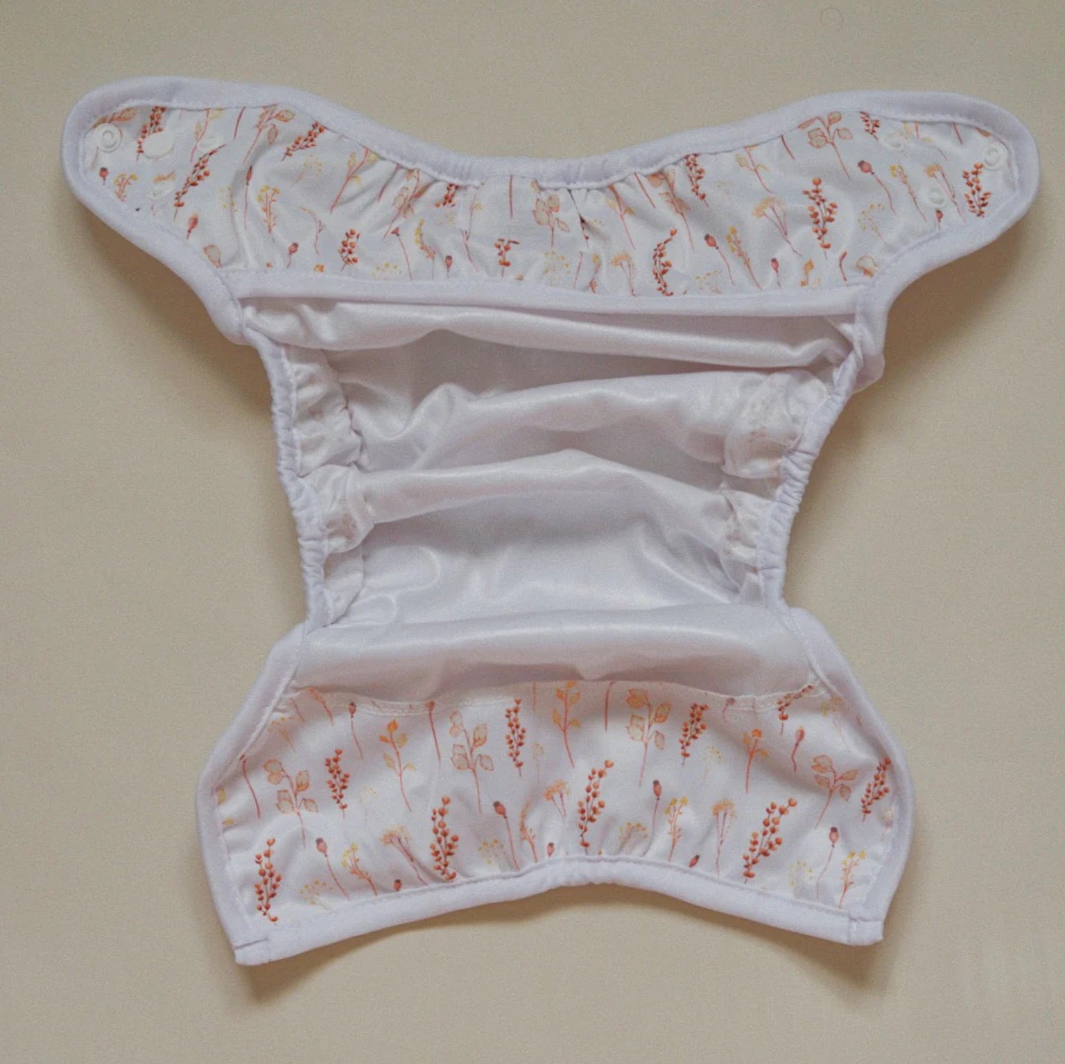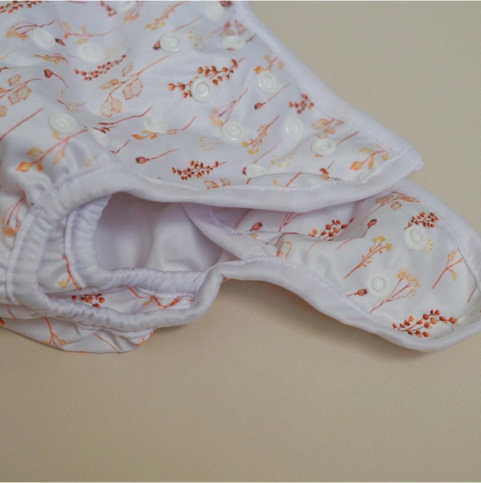 This wrap can be paired with flat nappies, fitted nappies and inserts - so however you choose to cloth bum, this will suit you. If choosing to pair with Fiyyah inserts they be snapped into the wrap. The wrap can last 2-3 nappy changes as long as it has not been soiled, just replace your chosen absorbent layer with a clean one.