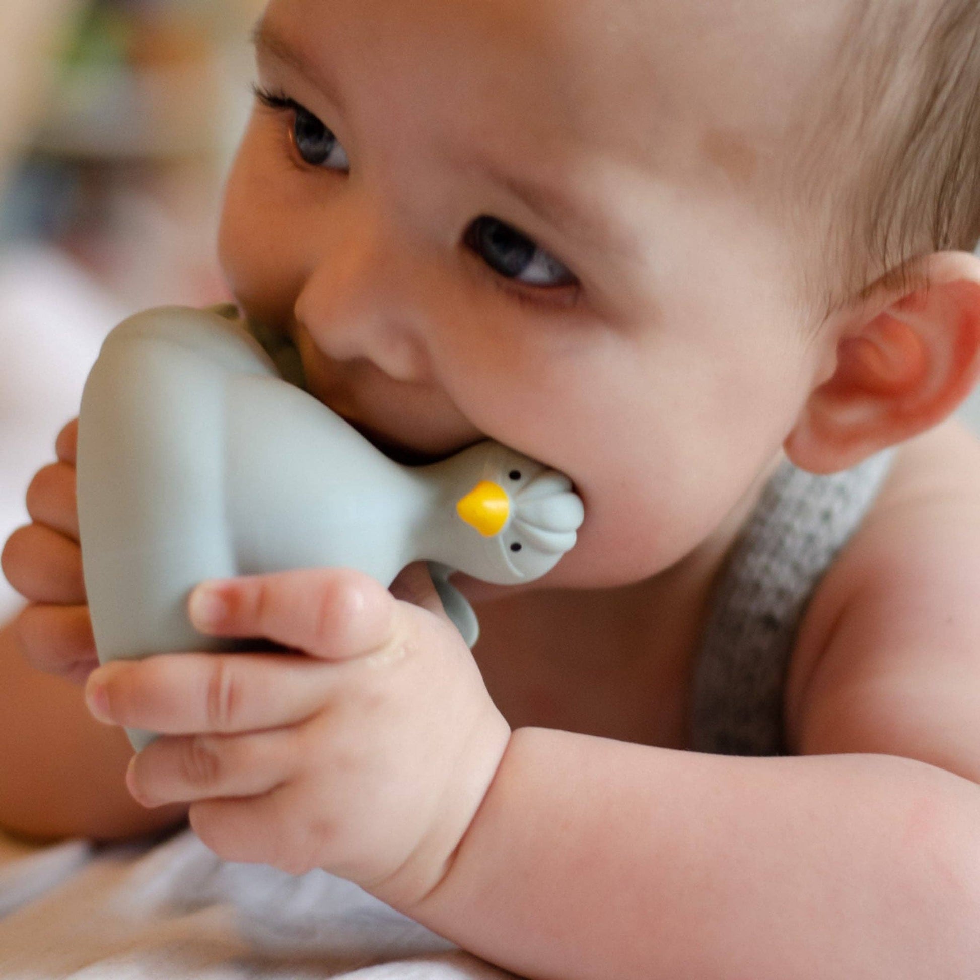 This charming peacock is the pinnacle of Nordic design: beautiful, but designed with purpose and practicality above all. This can be used a a bath toy, a teether, and even for sensory play. The variety of texture and firmness of the rubber means it is suitable for each stage of teething whilst also a delight to the touch. It is air-filled and features no holes or valves that would let mould and bacteria accumulate inside.