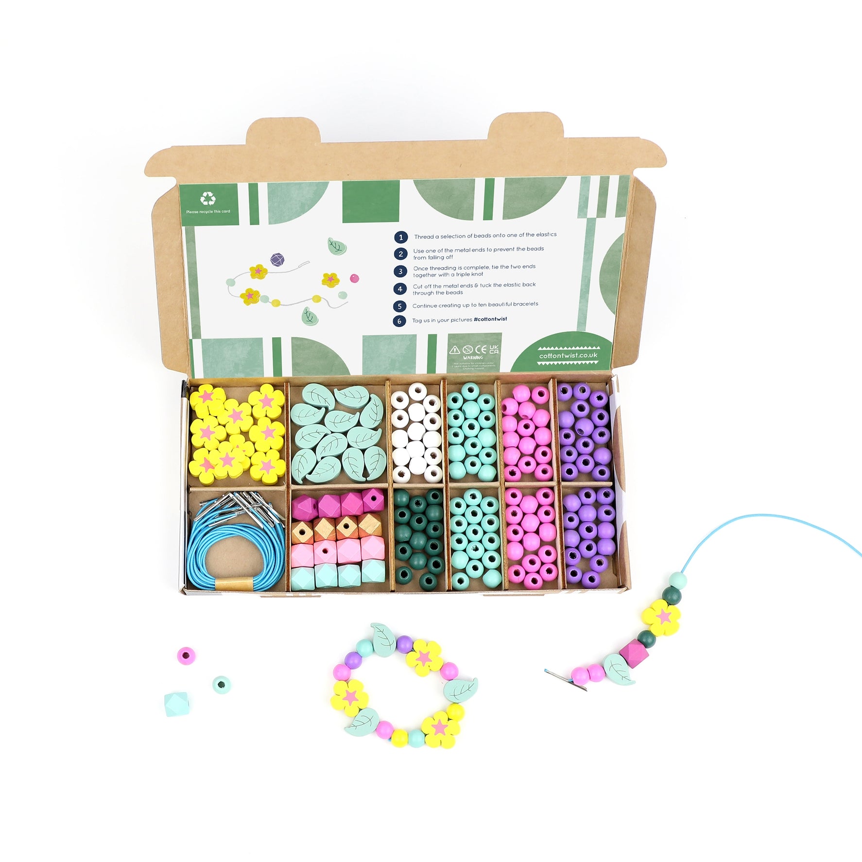 With enough beads to make ten bracelets you can make extras and give them to your friends! A selection of flowers, leave, geometric and colourful spacer beads complete the set and the elastic has metal ends to make it easier for little ones to thread the beads.